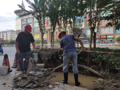 9月9日,我們跟隨搶修車輛來到了今天的第一站:乾坤商務酒店門口,由于管道漏水,現場不斷有水從地底滲出,加上地點特殊我們搶修工只能用鐵鍬等工具將道路破開,再找出破損位置,對管道進行更換維護處理。